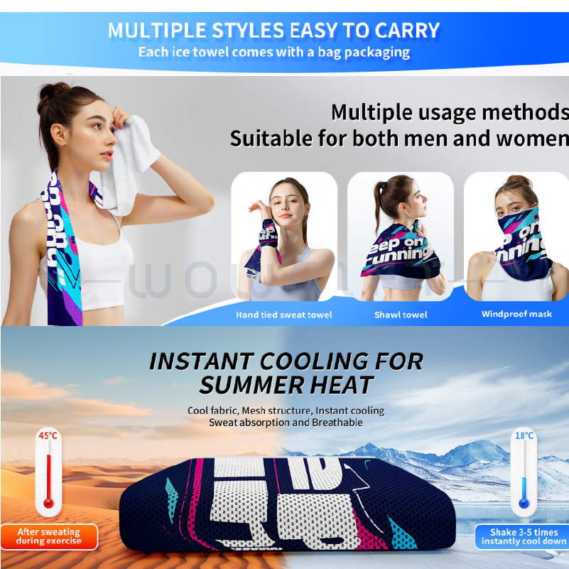 涼感毛巾是一款集功能性和時尚性於一體的產品,非常適合戶外活動和日常使用。我們的涼感毛巾具有以下特點: 產品型號依照尺寸編碼,您也可以客製。單面全彩昇華印刷。四邊拷克線可依設計圖配色。使用科技纖維涼感毛巾布。SGS檢驗合格,不含化學添加劑。這款涼感運動毛巾是一款多功能且實用的產品,適合戶外工作者、運動員和戶外休閒者使用。其「涼感加Logo印記・觸冰激活・品牌DNA覺醒」的特性,讓您的品牌在每次使用時都能展現魅力。使用方法簡單:沾水輕擰即可。
