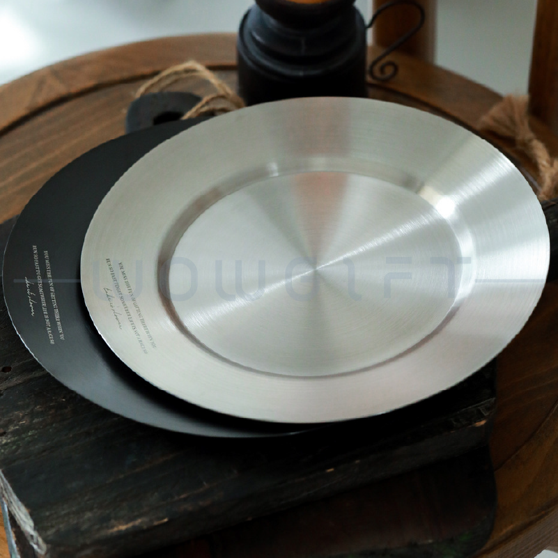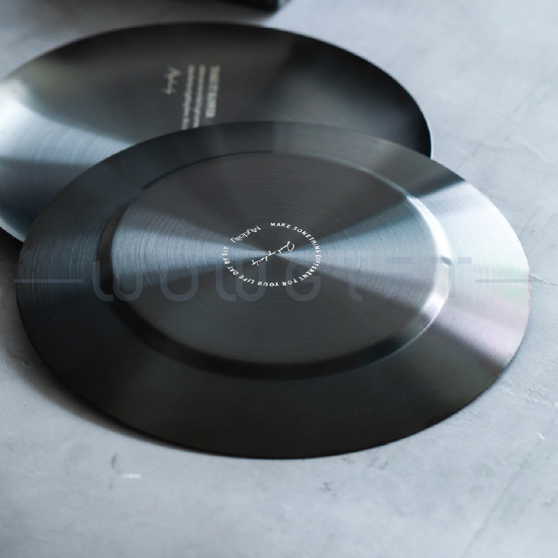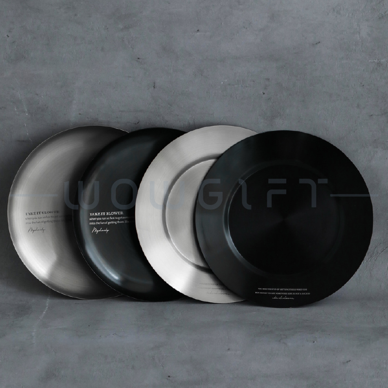 霧黑/銀色拉絲質感不鏽鋼金屬盤,適合餐飲、咖啡與酒商品牌作為門市擺盤、試飲小食盤或禮盒內襯展示。可客製 LOGO/品牌字樣,提升陳列一致性與品牌辨識度,亦適用開幕贈禮、會員禮與活動伴手禮。