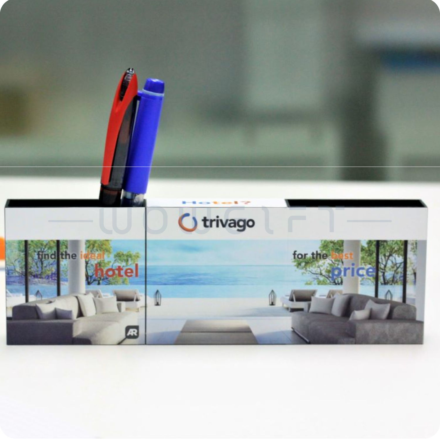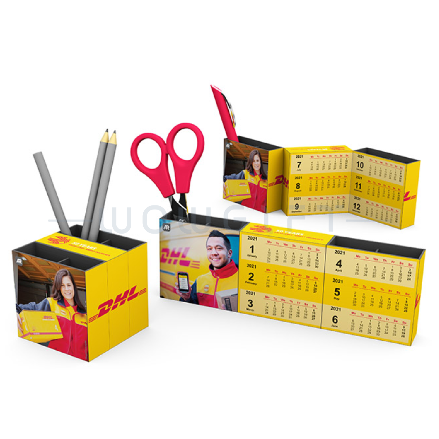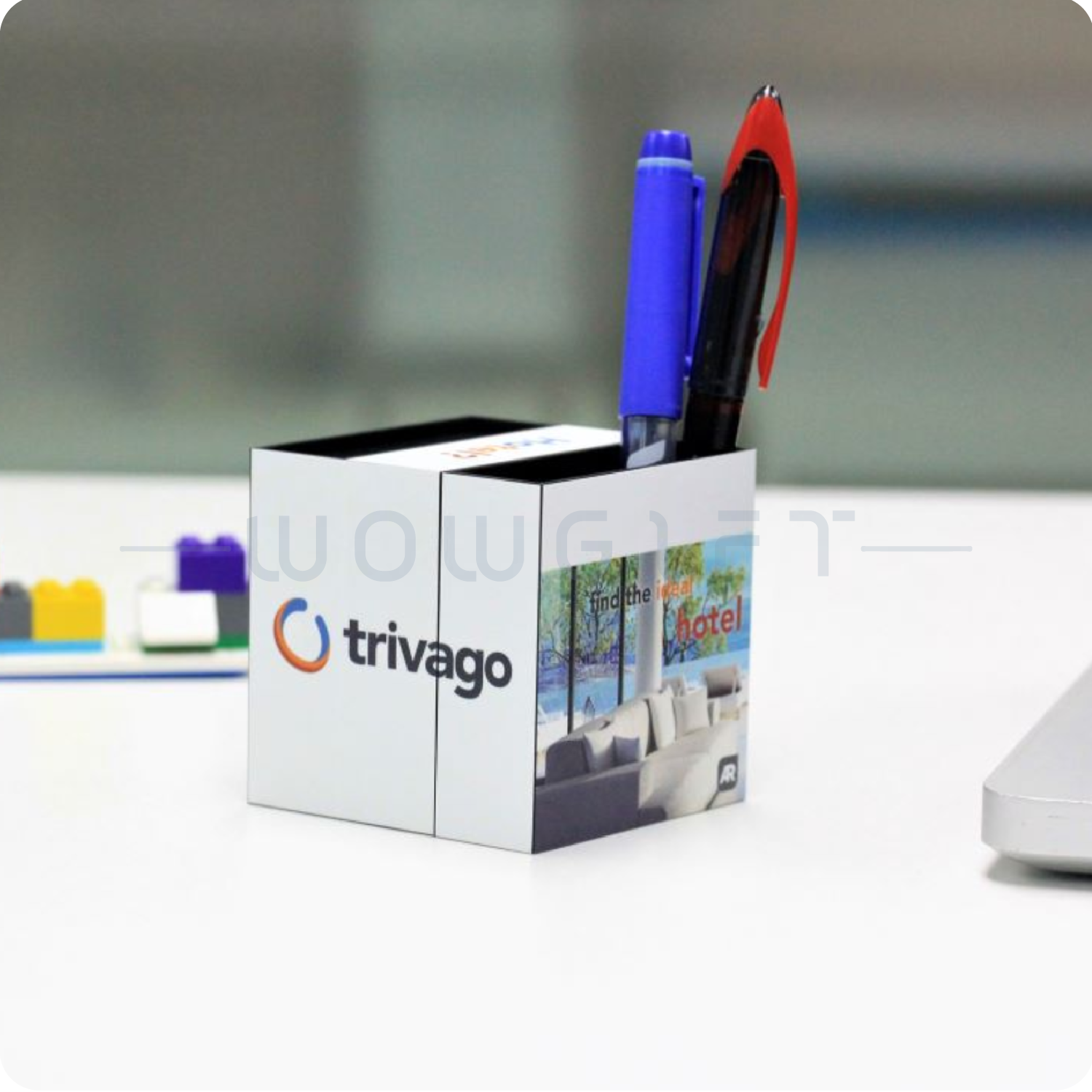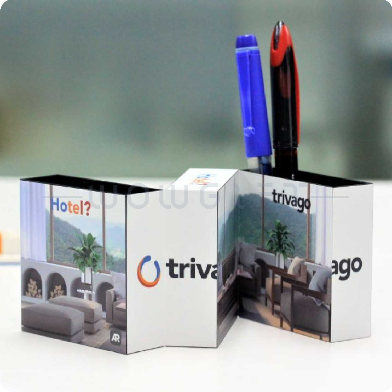 魔法三面筆筒能從立方體展開,形成多面向廣告展示區,可自由翻頁呈現不同訊息。