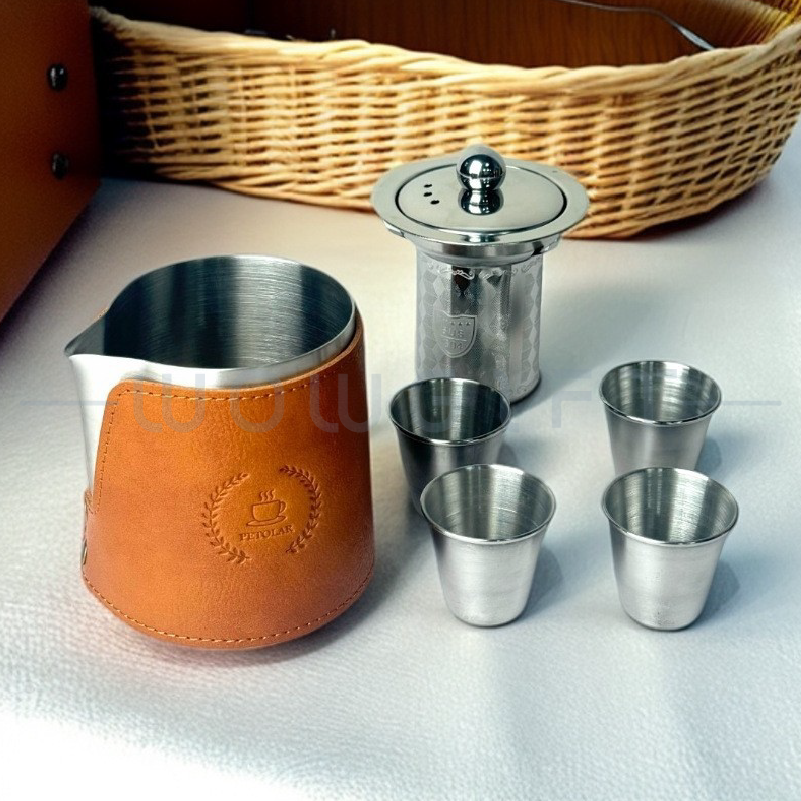304 Stainless Steel|Portable Brewing|Logo Customization這款 復古皮革便攜茶具套組 採用 304 不鏽鋼打造,不易留味、耐用好清潔,外層包覆質感 PU 皮革,兼具復古美感與手感。內含茶壺、茶杯等組件,可滿足戶外露營、品茗聚會、商務辦公的即席泡茶需求。支援企業 LOGO 客製化,是極具質感的企業禮品、會員贈禮或品牌形象贈品。